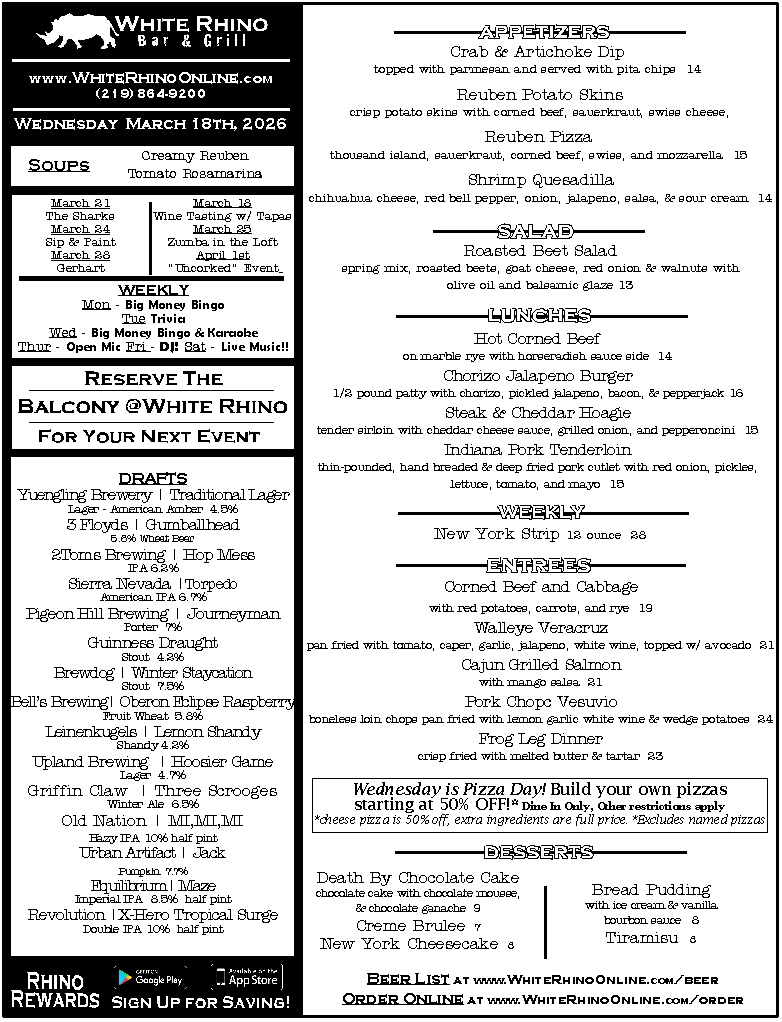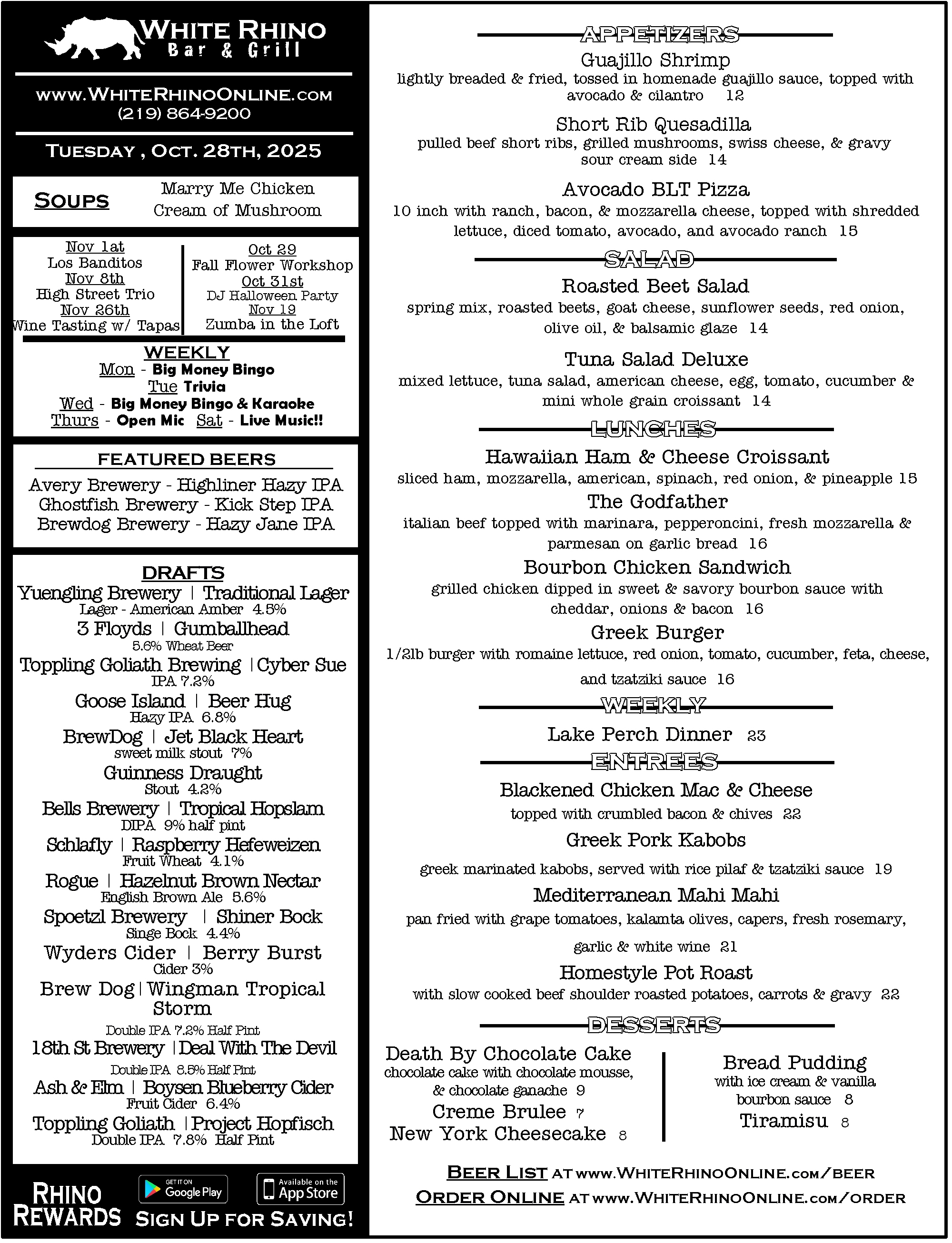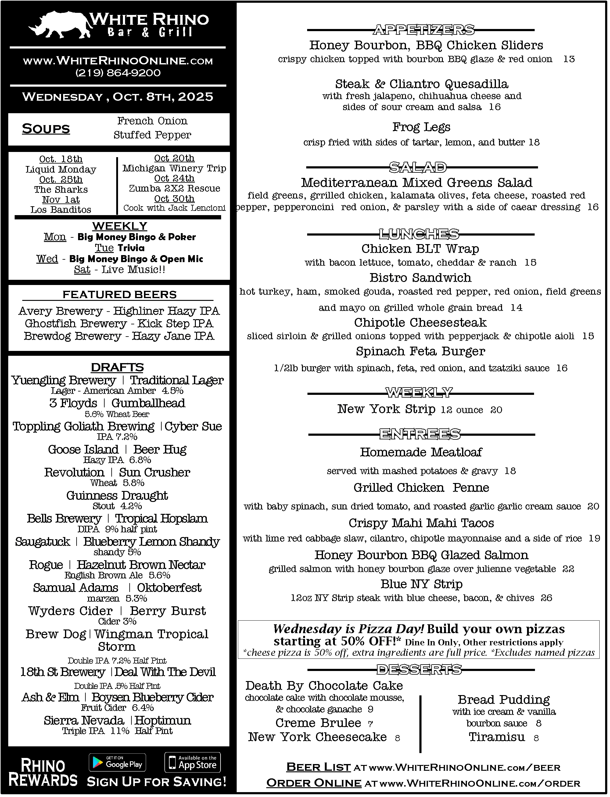 WHITE RHINO BEEF 14 our most popular sandwich! slow roasted beef thinly sliced and soaked in au-jus, with mozzarella cheese