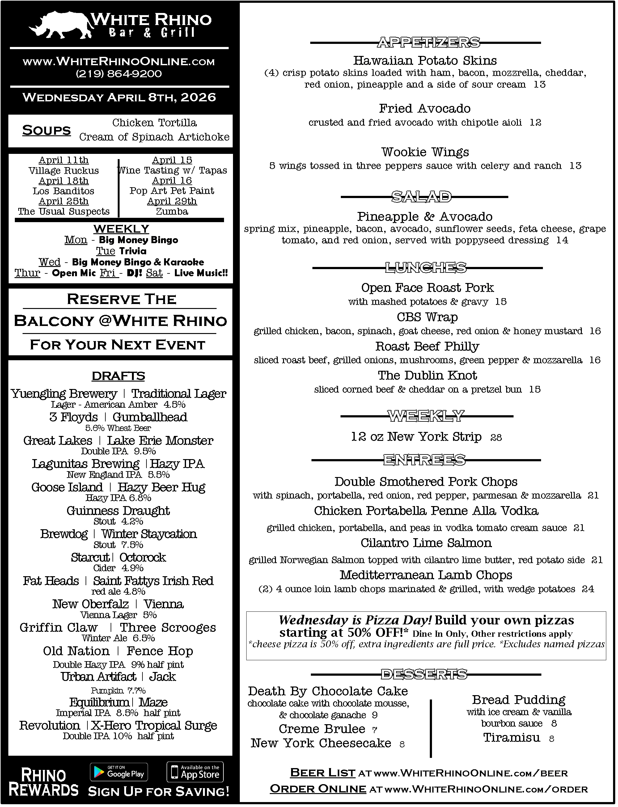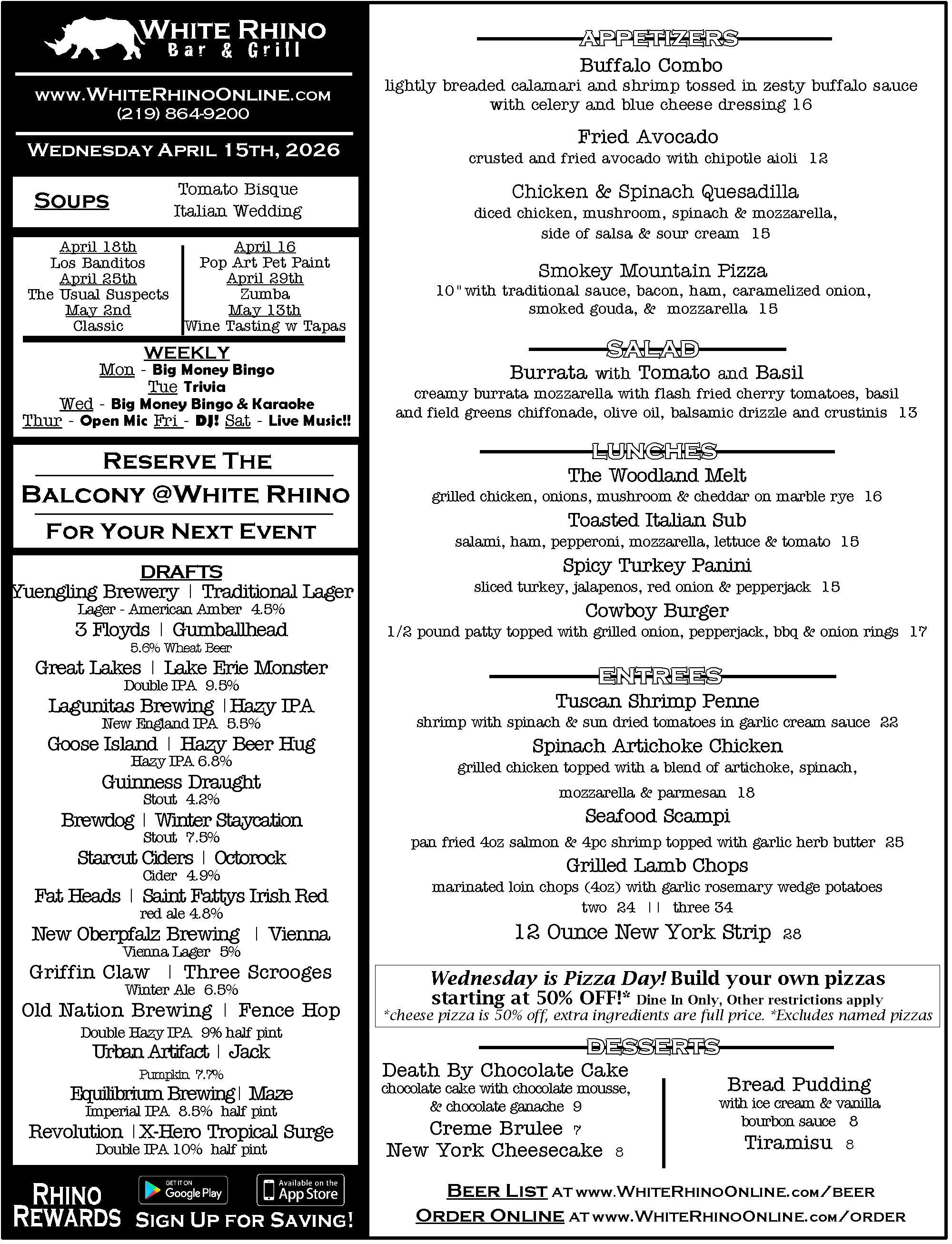 WHITE RHINO SPECIAL 15 / 19 / 25 sausage, mushroom, green pepper, onion, black olives