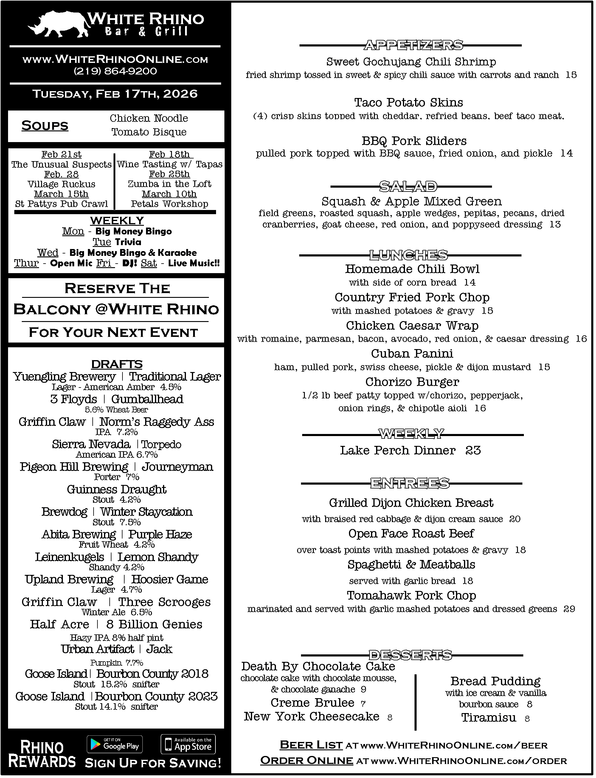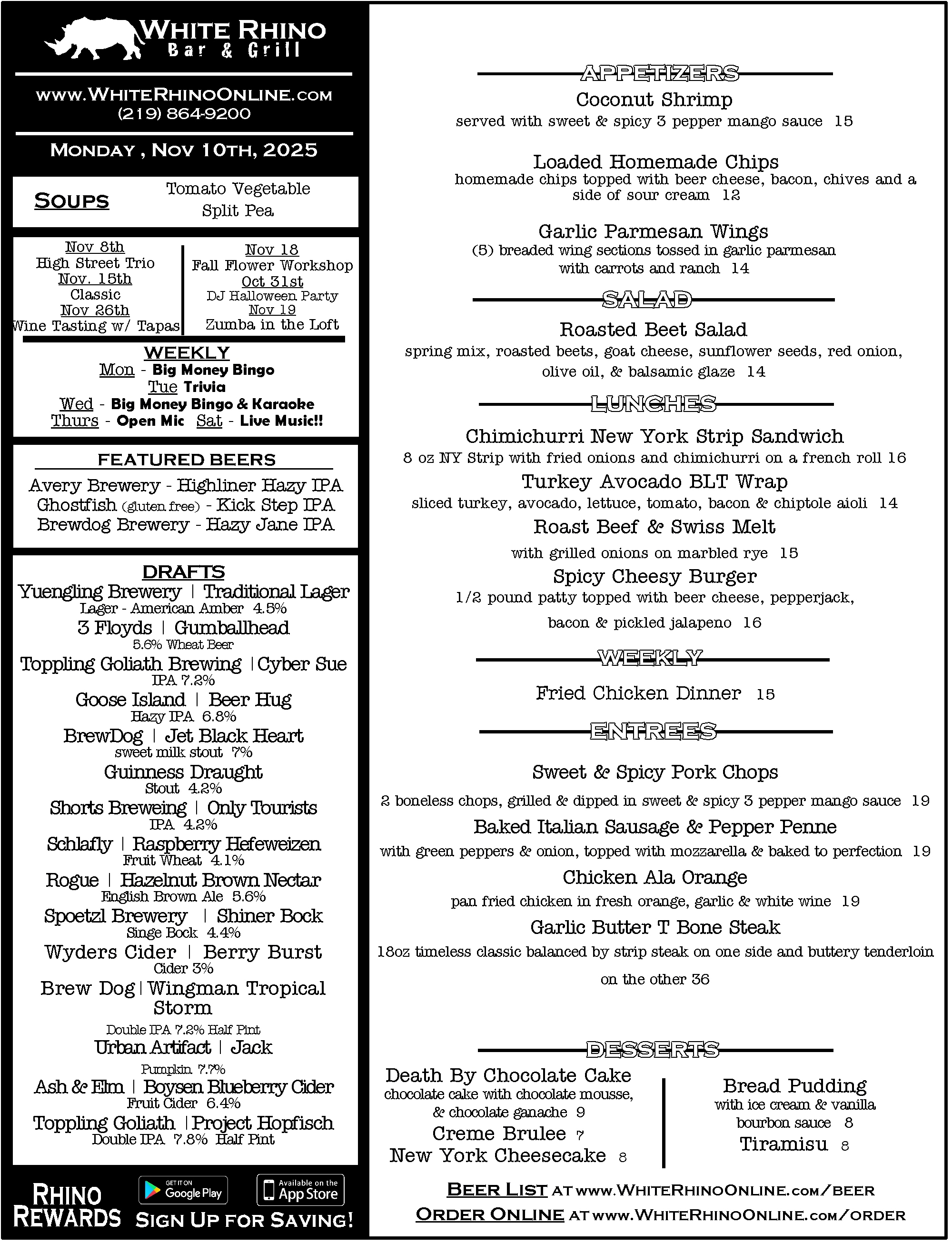 WHITE RHINO BEEF 14 our most popular sandwich! slow roasted beef thinly sliced and soaked in au-jus, with mozzarella cheese