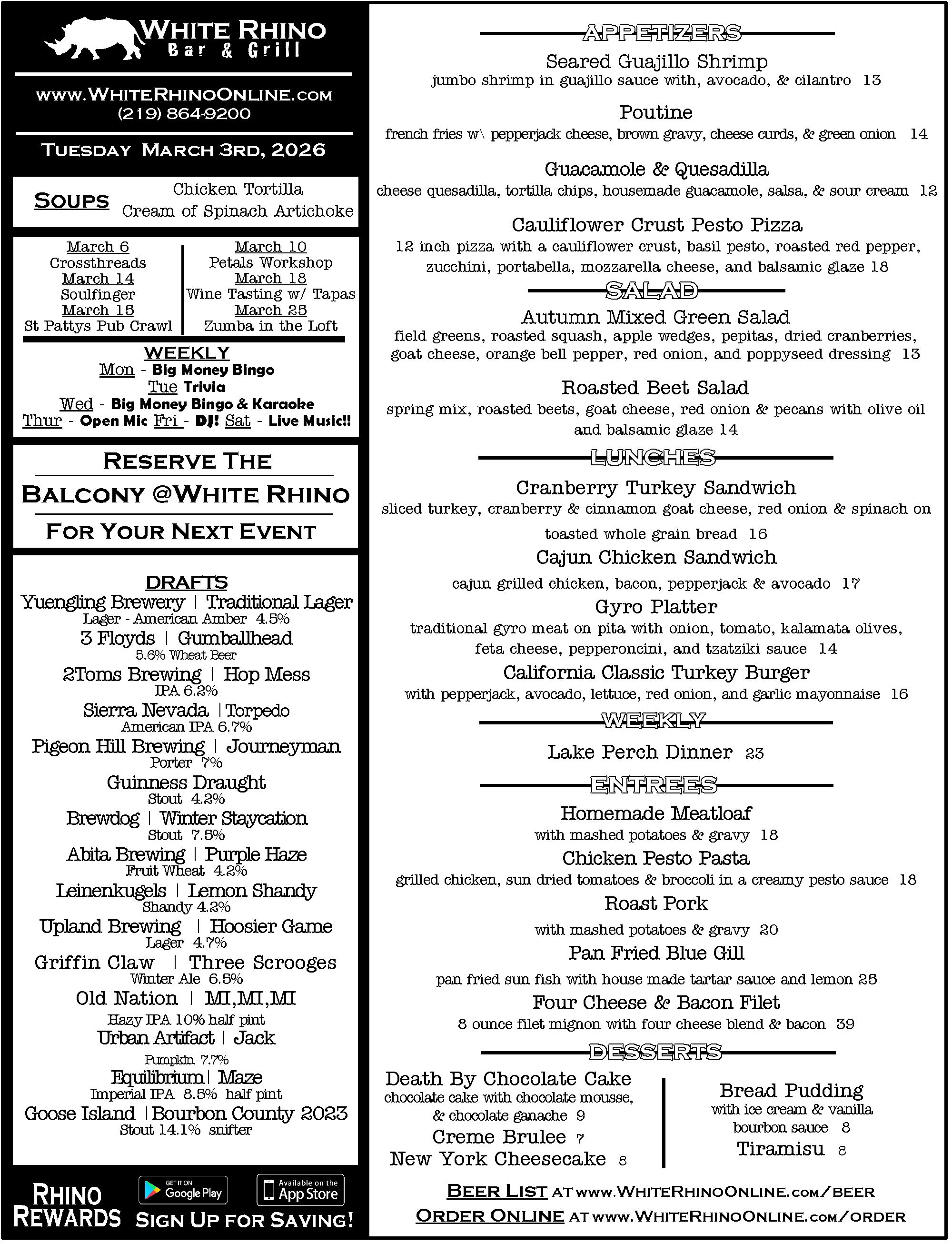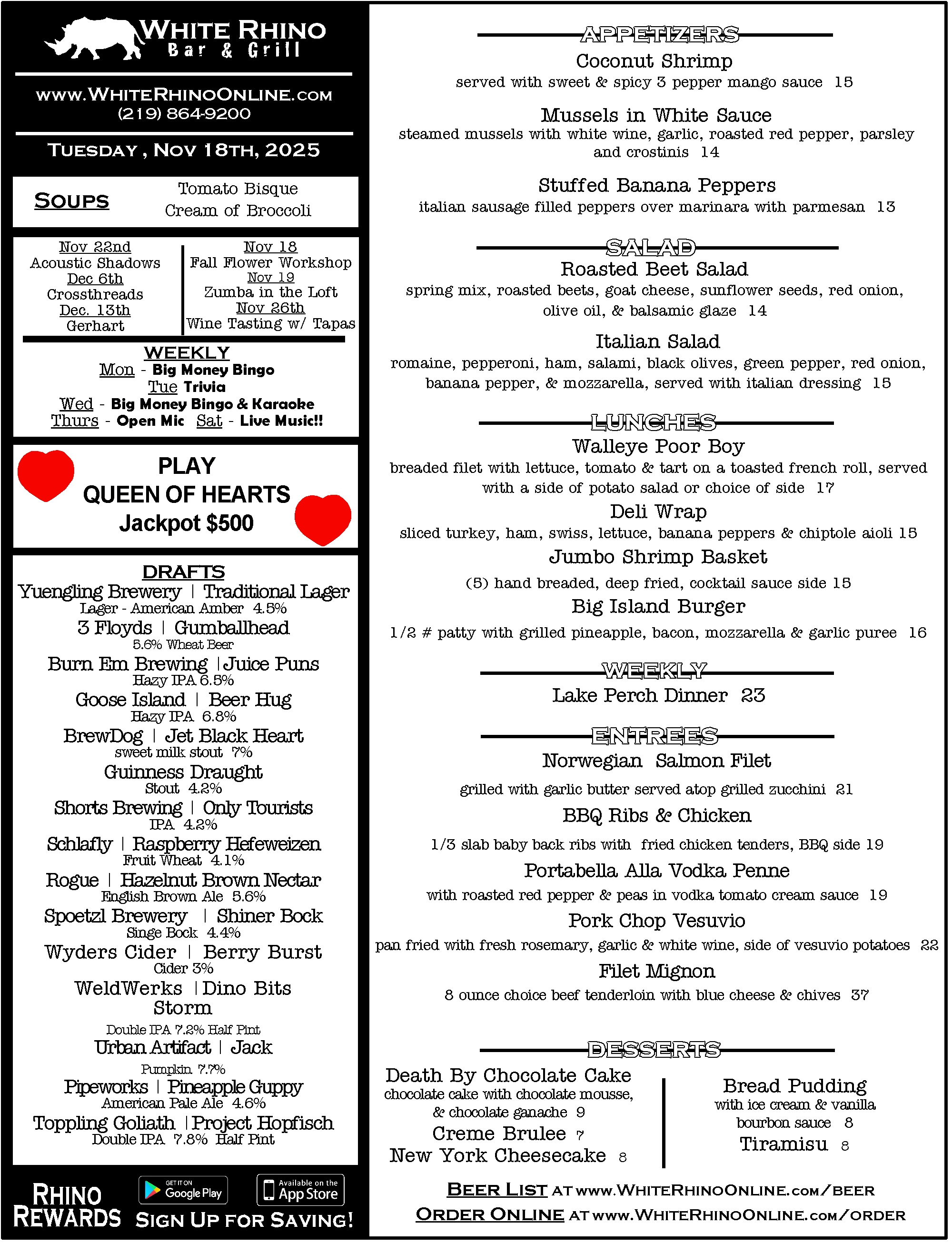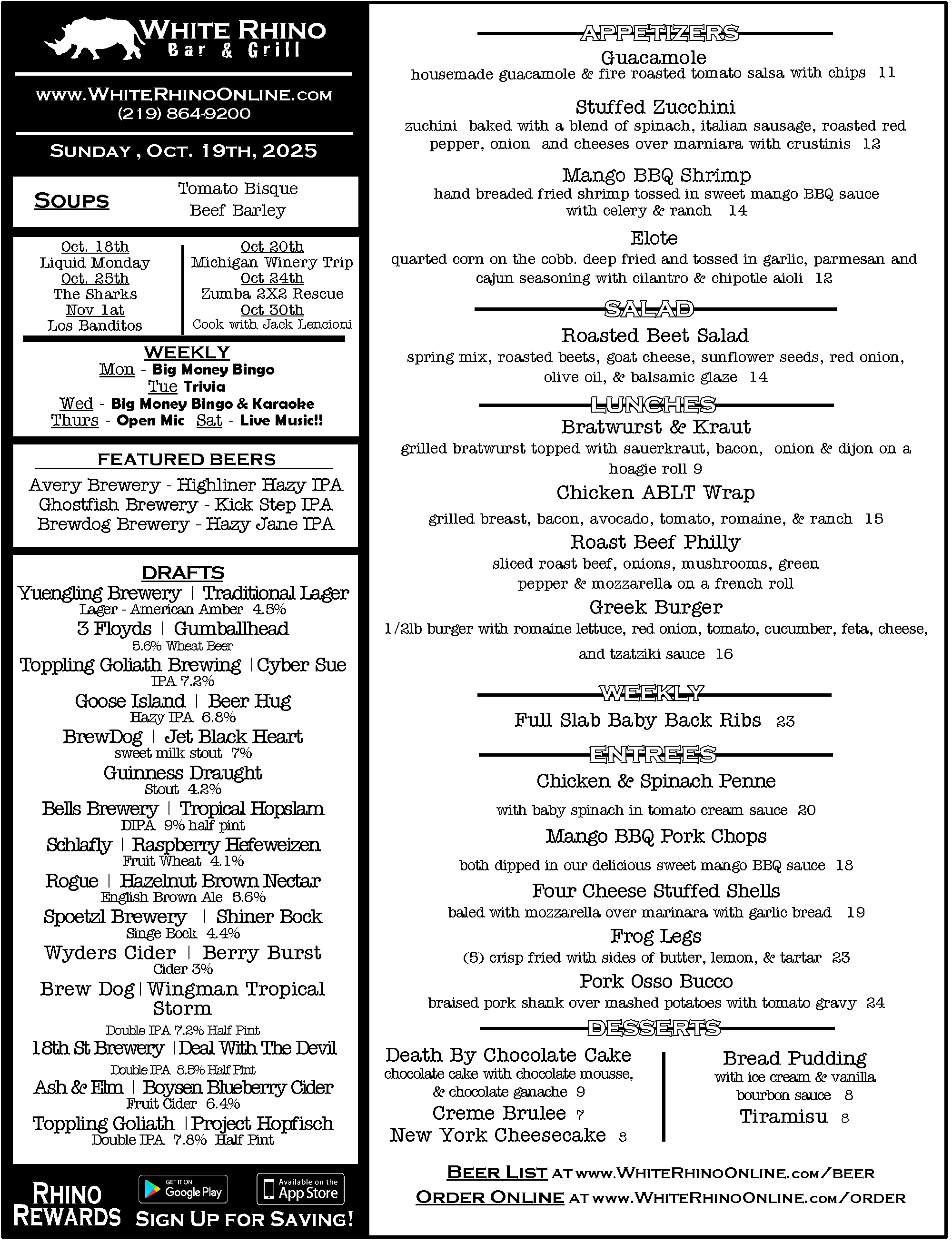 WHITE RHINO BEEF 14 our most popular sandwich! slow roasted beef thinly sliced and soaked in au-jus, with mozzarella cheese